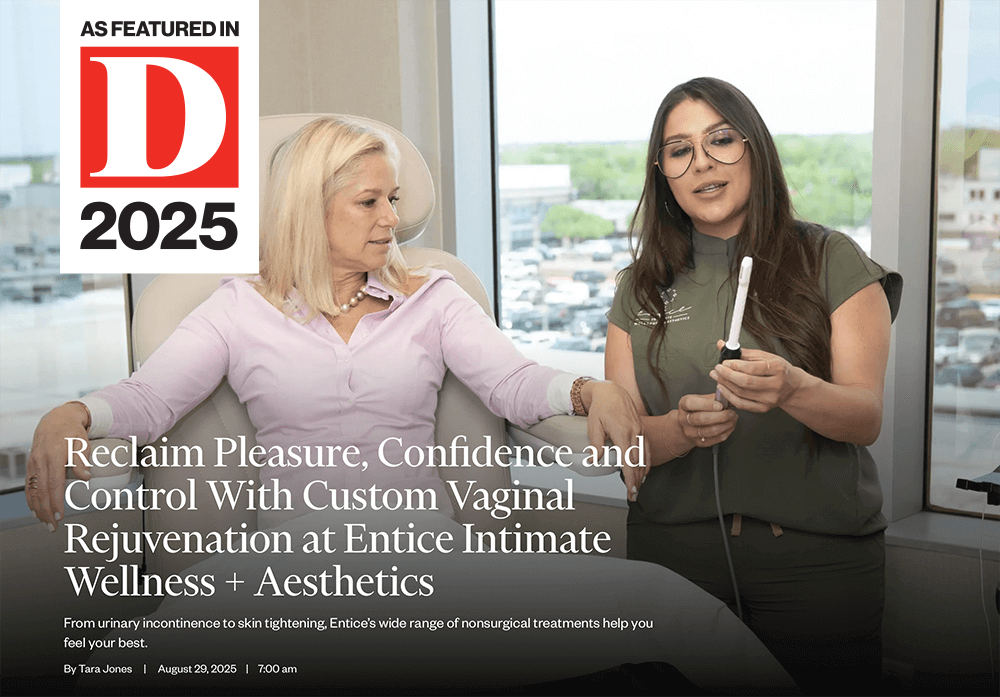 If you’re experiencing persistent discomfort, loss of sensation, bladder leakage, or difficulty with arousal, seeking expert care can help you restore confidence and pleasure. Starting in your 40s, decreasing estrogen levels can negatively affect feminine tissues resulting in Genitourinary Syndrome of Menopause (GSM) causing painful sex. Entice specializes in advanced noninvasive solutions tailored to every woman’s unique needs in a discreet, supportive environment to address GSM, sexual dysfunction, decreased libido, urinary incontenence, vaginismus, and Lichen Sclerosis.